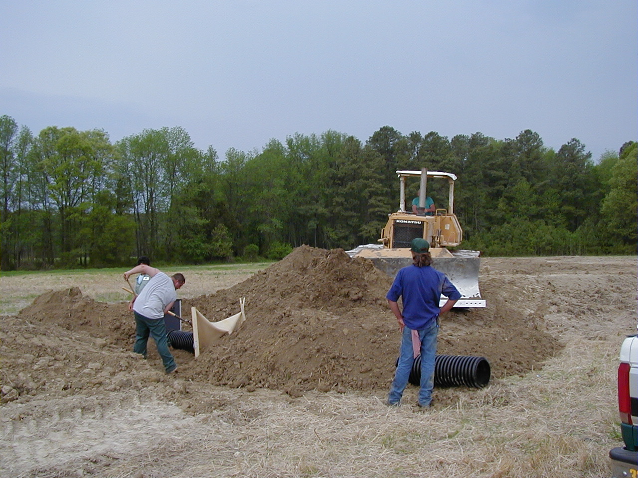 Picture showing intake pipe (foreground), output pipe, anti-seep collar (beige item around pipe) and water level control structure.